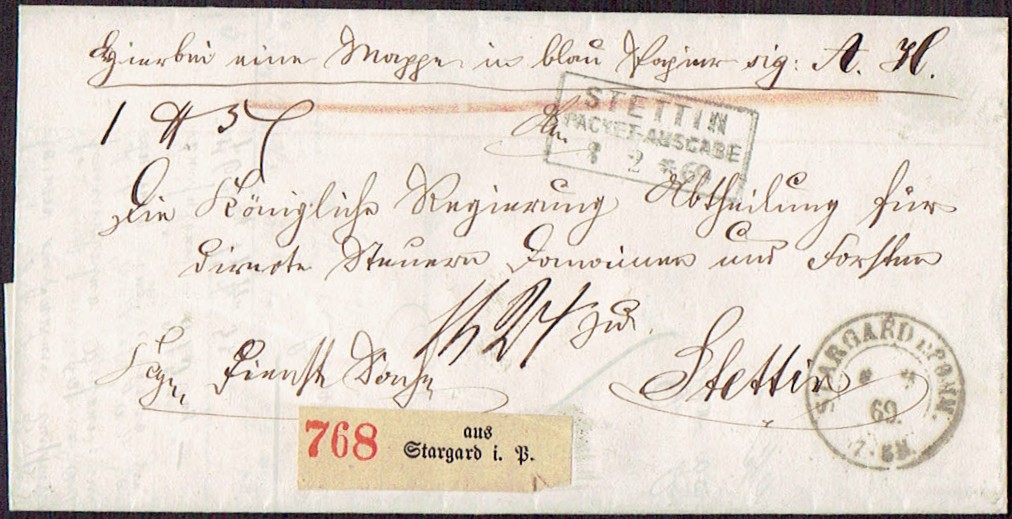 1869 Stargard, list z treścią towarzyszący paczce wysłanej do Stettin (Szczecin), z tyłu bardzo dobrze zachowana pieczęć lakowa. | |