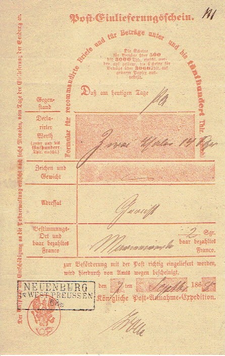 1868 Neuenburg (Nowe k.Świecia), poświadczenie nadania przesyłki pieniężnej do Marienwerder (Kwidzyń). | |