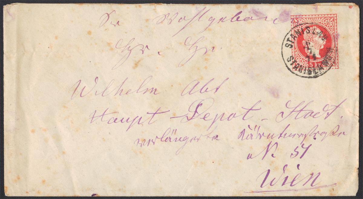 1874 STANISŁAWÓW, austriacka koperta za 5 kr formatu 154x85 mm, na tylnej klapie suche tłoczenie (Klappenstempel), papier ze znakiem wodnym, wysłana 6/7 do Wiednia, dwujęzyczny datownik nadawczy STANISLAU STANISŁAWÓW; na odwrocie wiedeński datownik odbiorczy; dobry stan zachowania. | Mi.U60I |