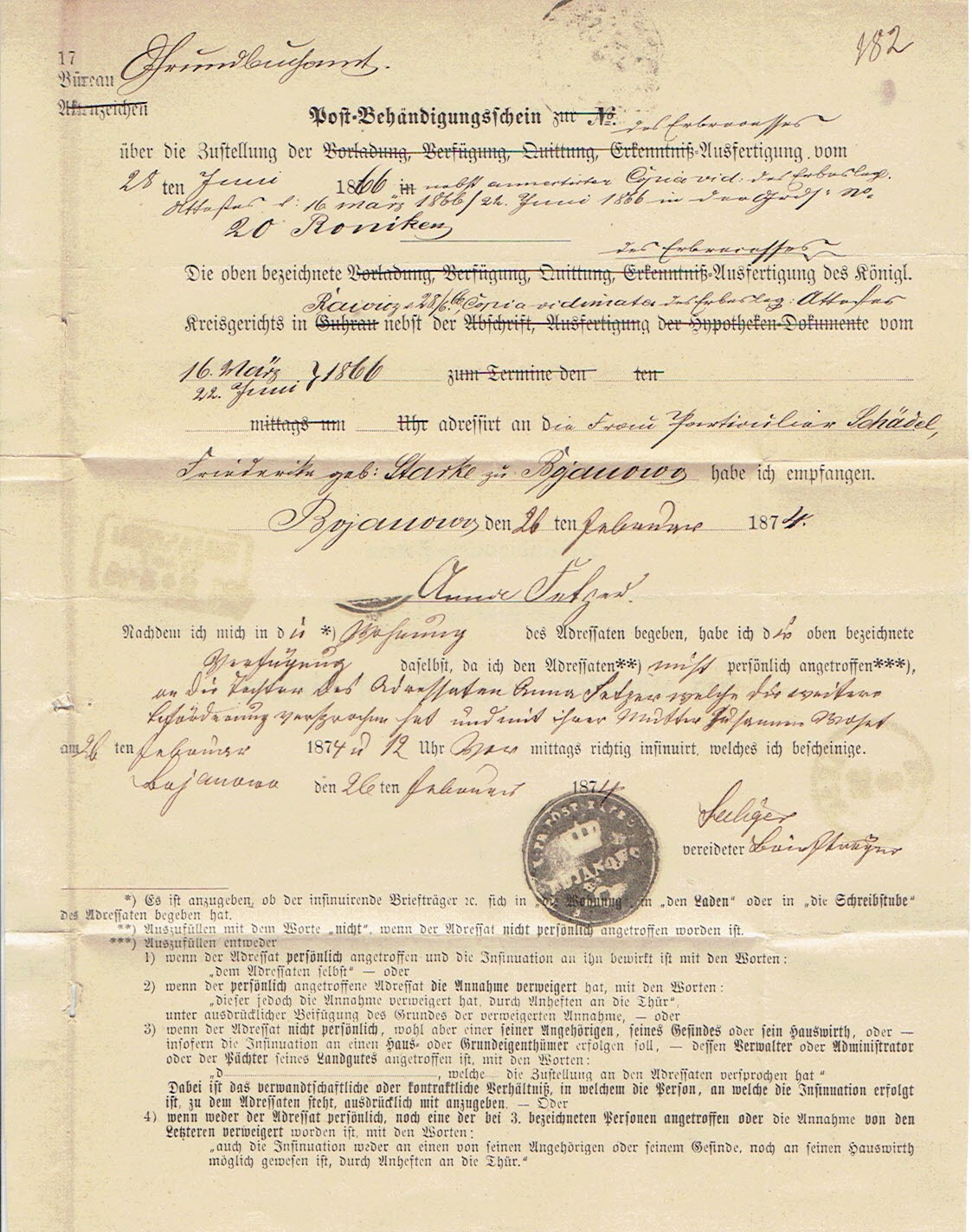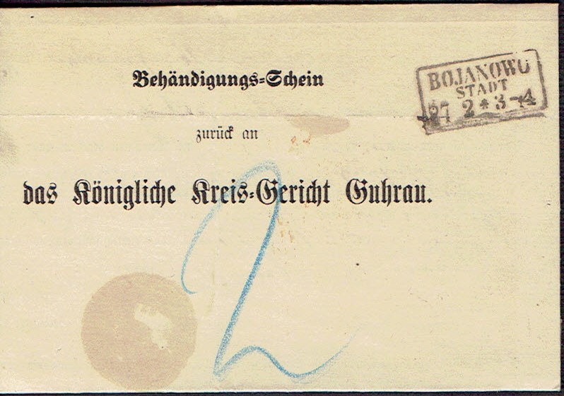 1874 Bojanowo (k.Rawicza), potwierdzenie doręczenia pisma sądowego. | |