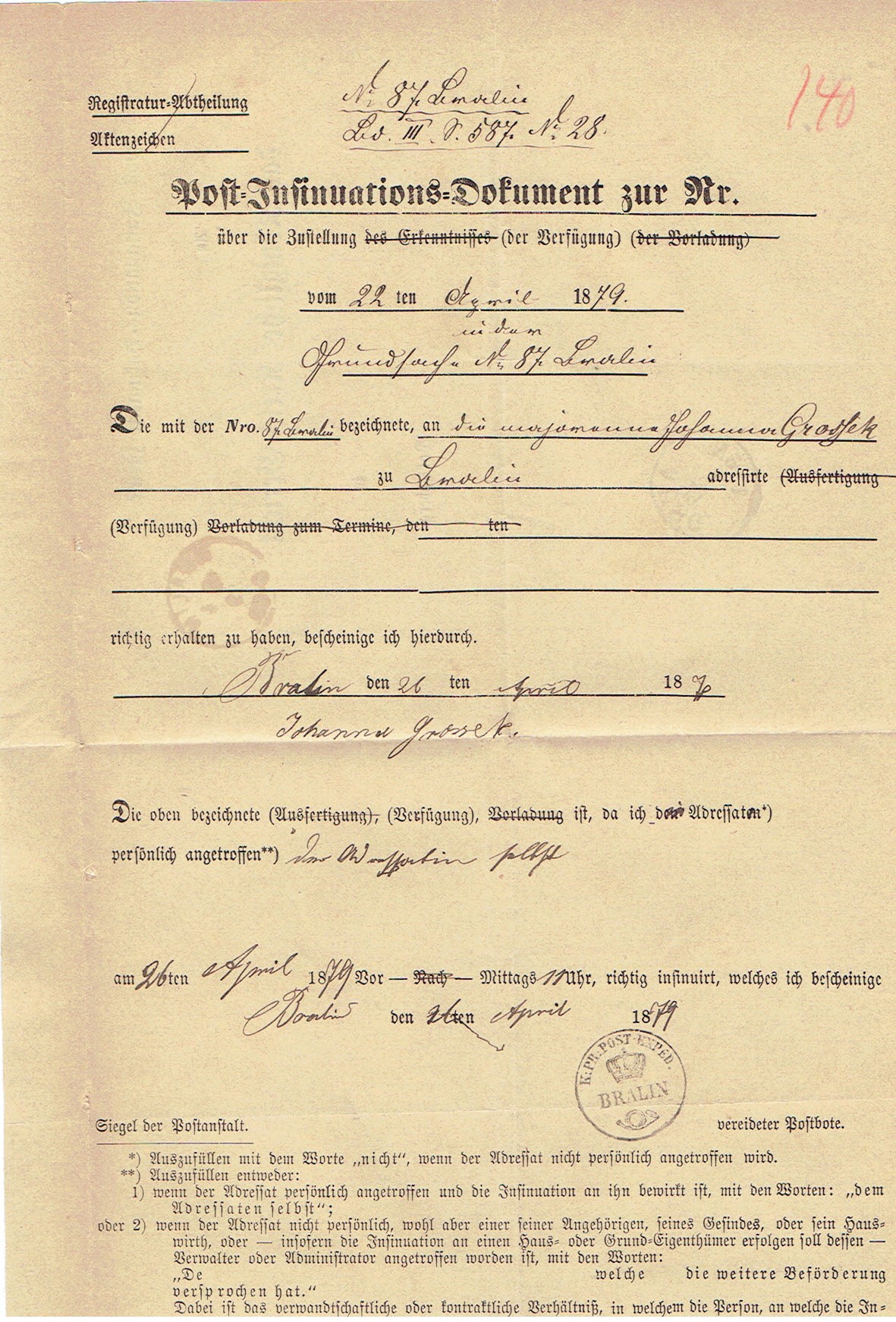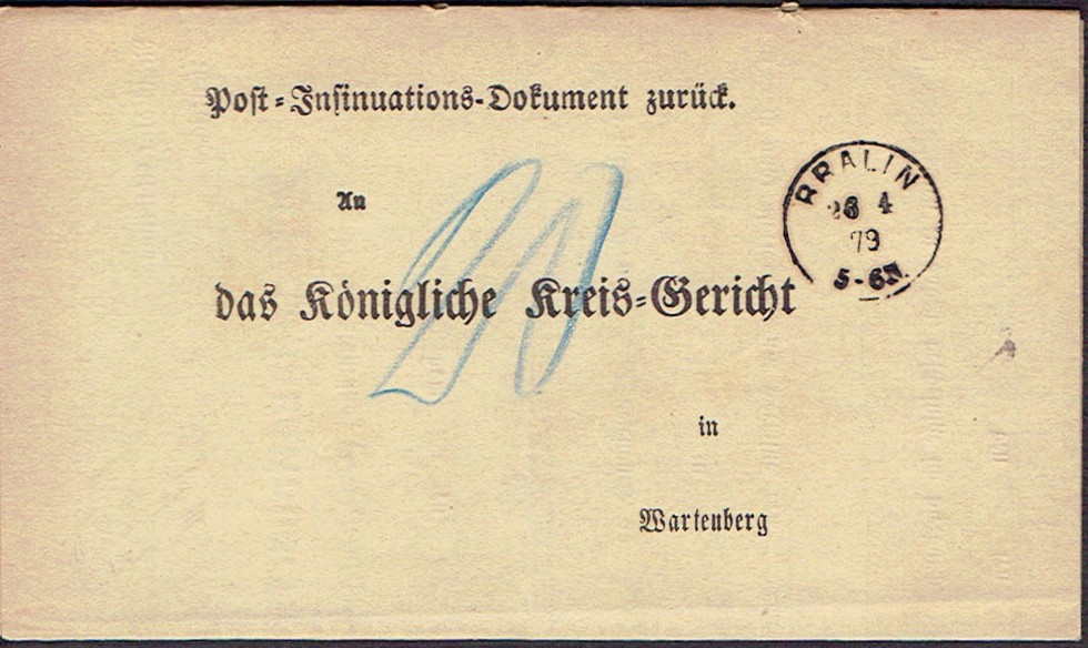 1879 Bralin (k.Kępna), potwierdzenie doręczenia pisma sądowego. | |
