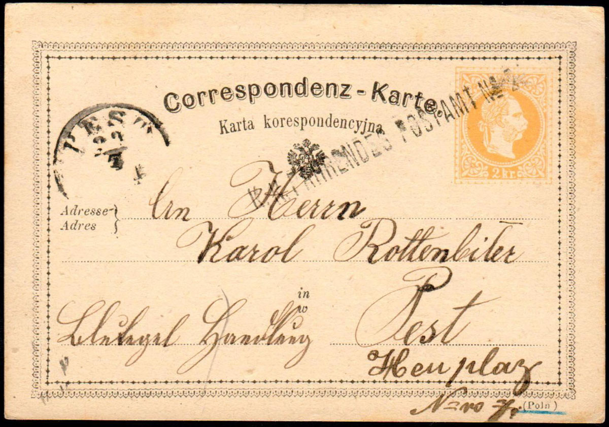 1873 karta wysłana z Rzeszowa do Pestu ambulansem kolejowym „K.K. FAHRENDES POSTAMT Nº 2". | |