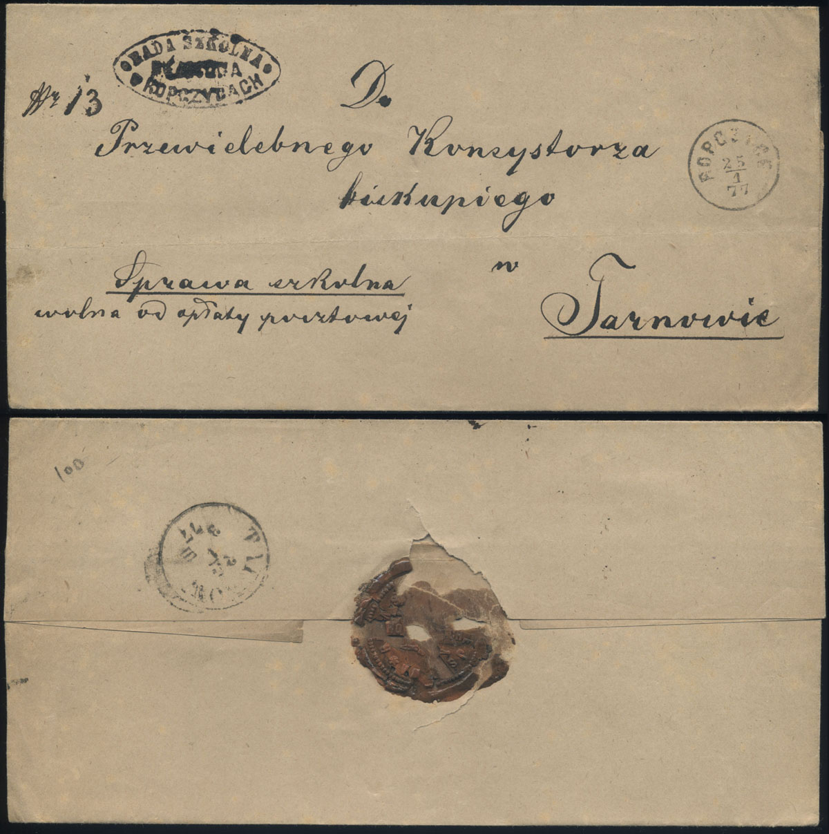 1877 obwoluta listu składanego z Ropczyc do Tarnowa. | |