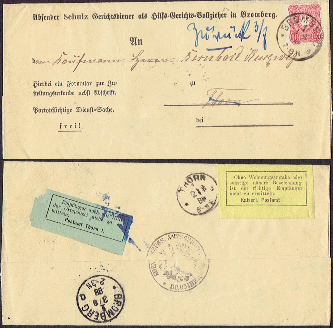 1888 Bromberg (Bydgoszcz), kompletny list składany wysłany z Bromberg do Thorn (Toruń), z powodu niedokładnego adresu list został zwrócony do nadawcy, ciekawe nalepki odpowiednie do danej sprawy. | |