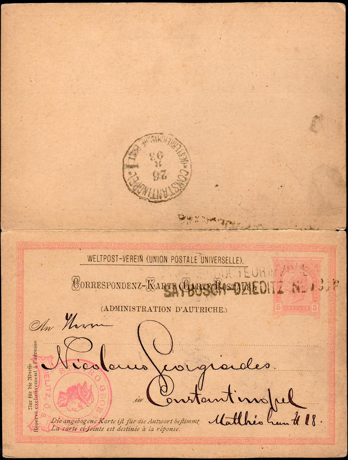 1893 konduktor pocztowy w pociągu Żywiec – Dziedzice, austriacka karta podwójna z opłaconą odpowiedzią wysłana z Bielska do Konstantynopola, stempel „POSTCONDUCTEUR IM ZUGE / SAYBUSCH-DZIEDITZ No...", datownik odbiorczy Konstantynopola. | |