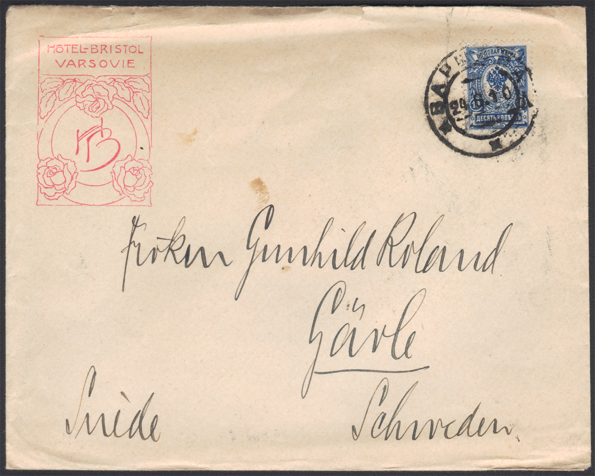 1910 koperta z papeterii Hotelu Bristol w Warszawie wysłana 24.6 do Garle w Szwecji, dwuobrączkowy datownik nadawczy urzędu Warszawa 1, na odwrocie datownik odbiorczy GEFLE z 10/7; dobry stan zachowania. | Mi.69I |