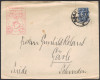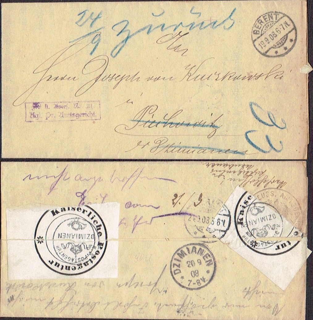 1908 Berent (Kościerzyna), kompletny list składany wysłany z Berent do Dzimianen (Dziemiany k.Kościerzyny). Ponieważ w Dziemianach taka osoba nie mieszkała a nie było adresu nadawcy list został otworzony w celu znalezienia nadawcy. Następnie list zamknięto, naklejono zaklejkę agencji Dzimianen i zwrócono do nadawcy. Cała sprawa została dokładnie udokumentowana w postaci stempli, zaklejek i odręcznych uwag. | |