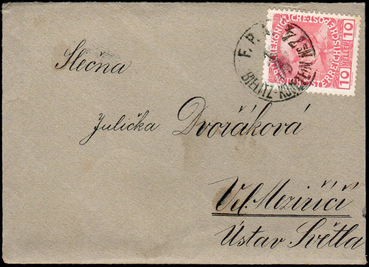1909 kartka nadana w ambulansie pocztowym na trasie Bielsko - Kojetein (Czechy) nr 74, na rewersie datownik odbiorczy. | |