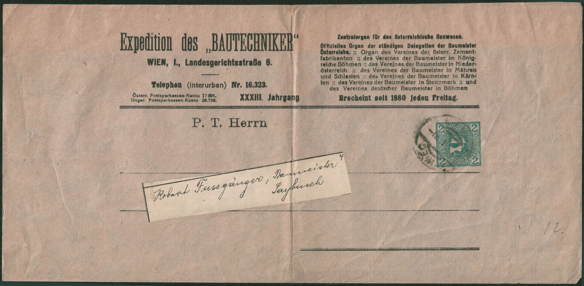 1910 austriacka opaska gazetowa wysłana miejscowo w Żywcu, opaska złożona w połowie. | |