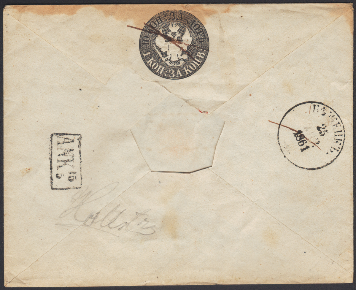 1861 Bieżeck-Helsinki, rosyjska koperta za 10+1 kop wydania z 1849 roku, o wymiarach 137x107 mm, ze znakiem wodnym Wz.I w położeniu lustrzanym, wysłana 23.IV z miejscowości Bieżeck do Helsinek (Helsingfors); znak opłaty skasowany przez kreślenie atramentem, poniżej datownik nadawczy BIEŻECK (БѢЕЖЕЦКЪ) z ozdobnikiem, fiński ramkowy stempelek odbiorczy "ANK 15 5"; słabszy stan zachowania.