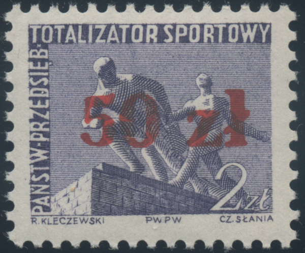 1960 nalepka Totalizatora Sportowego, staloryt Czesława Słani z nadrukiem wysokiej nowej wartości 50 zł.
