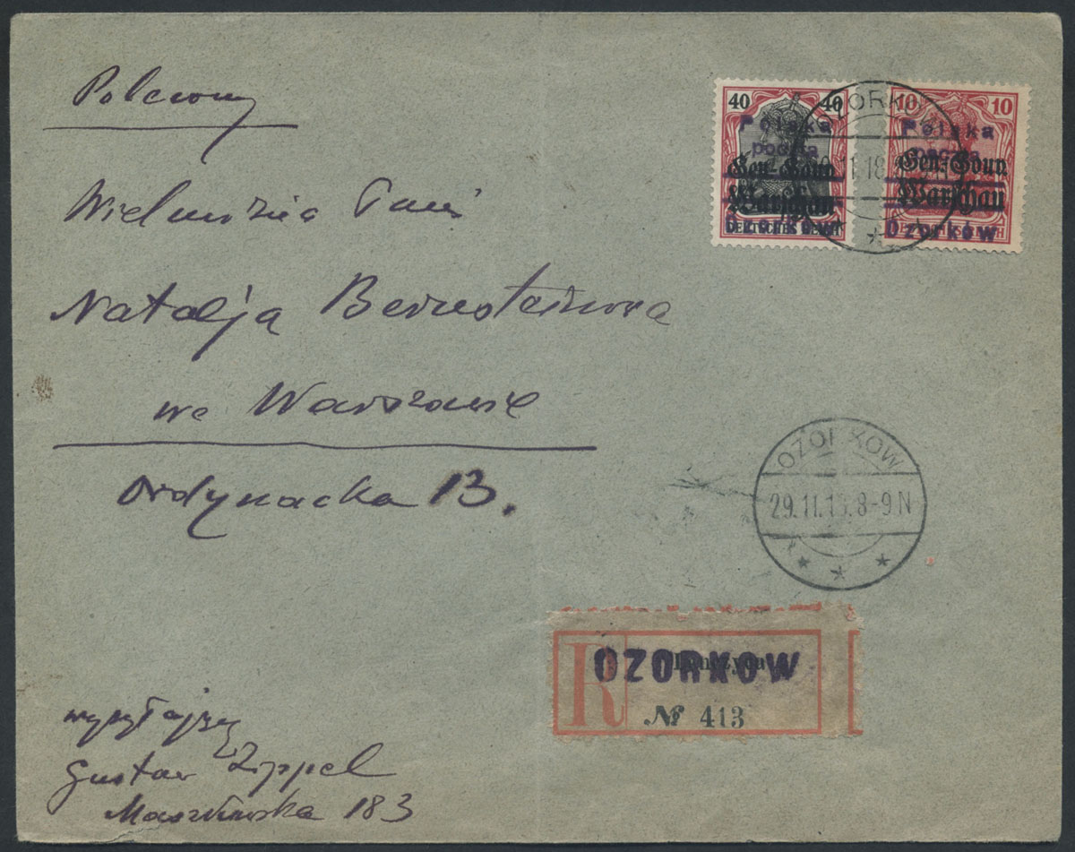 1918 Ozorków, list polecony z Ozorkowa do Warszawy nadany 29.11.18, znaczki z nadrukiem lokalnym, list prawidłowo opłacony, na odwrocie stempel odbiorczy. | |