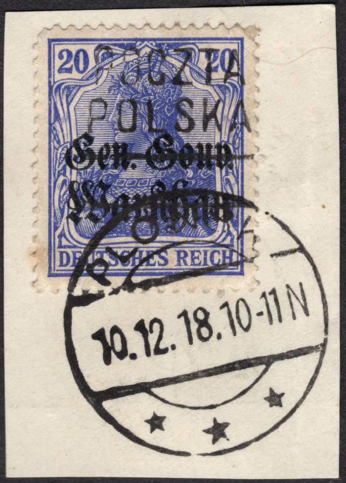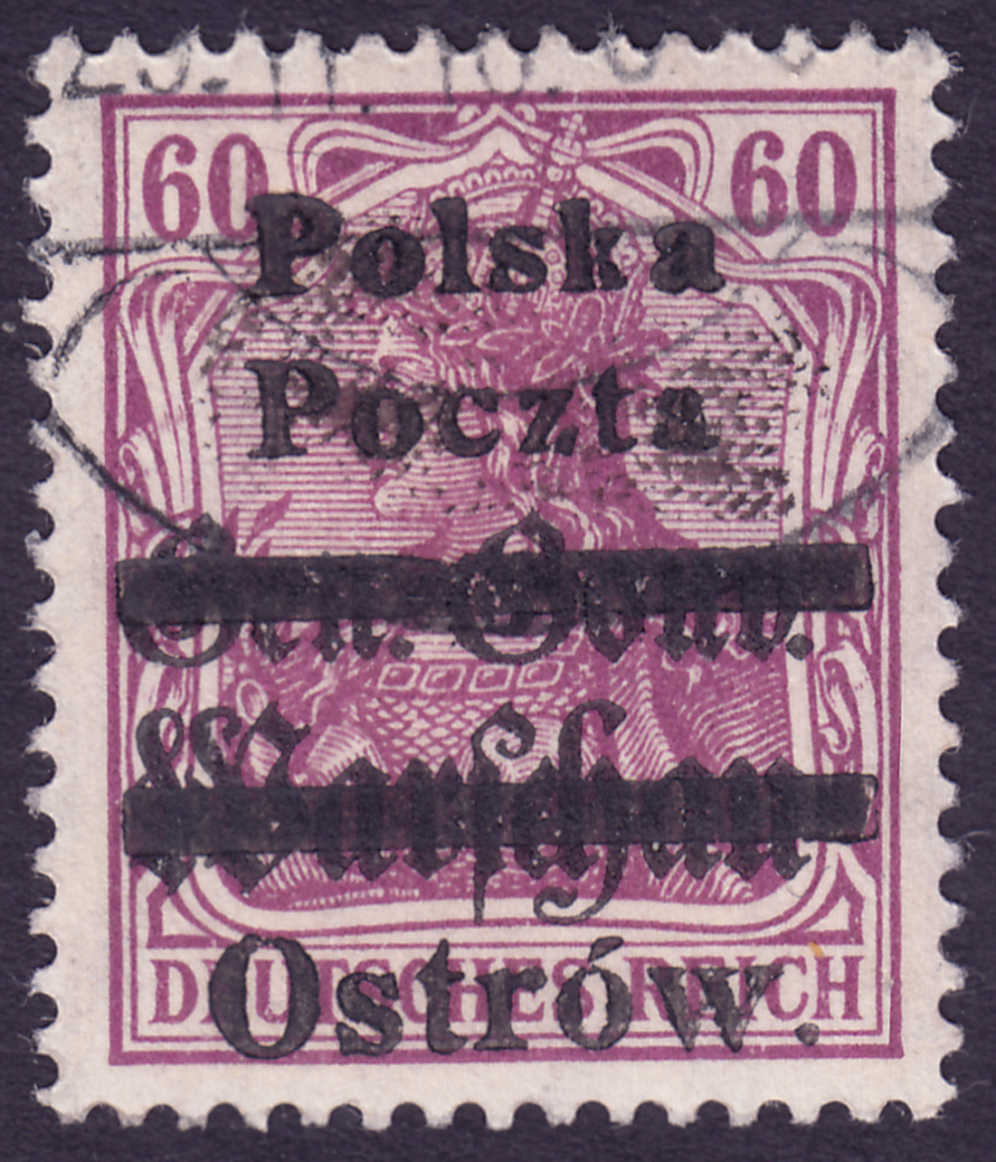 1918 Ostrów, znaczek okupacji niemieckiej - "Gen.-Gouv. Warschau" za 60 fen. z nadużyciem nadruku lokalnego "Polska Poczta / dwie belki / Ostrów" I formą o wymiarach 18 x 18,75 mm - typ I obie litery P duże; wykonanym matową farbą z oczyszczonej, ale oryginalnej formy z inspiracji Josepha Feinmessera; nadruk wykonano na oryginalnych znaczkach GGW w tej samej drukarni - R.Janowskiego, co właściwy; poczta nie poniosła uszczerbku bo w obiegu były zarówno znaczki z nadrukiem jak i bez; nadużycia spotyka się na oryginalnej korespondencji, niekiedy razem ze znaczkami prawdziwymi, na tej wartości nie znaleziono dotąd prawdziwego nadruku, ciekawe do specjalizacji. | Fi.10I ND |