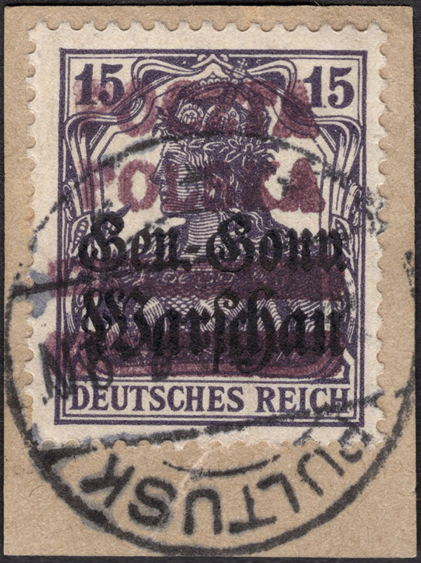 1918 Ostrów, znaczek okupacji niemieckiej - "Gen.-Gouv. Warschau" za 40 fen. z lokalnym nadrukiem I formą o wymiarach 18 x 18,75 mm typu I "Polska / Poczta / dwie belki / Ostrów" (Fi.500.-), kasowany unarodowionym datownikiem na wycinku, ładny stan; gwarancja Krawczyk. | Fi.9I |