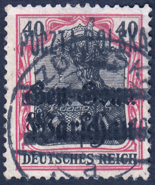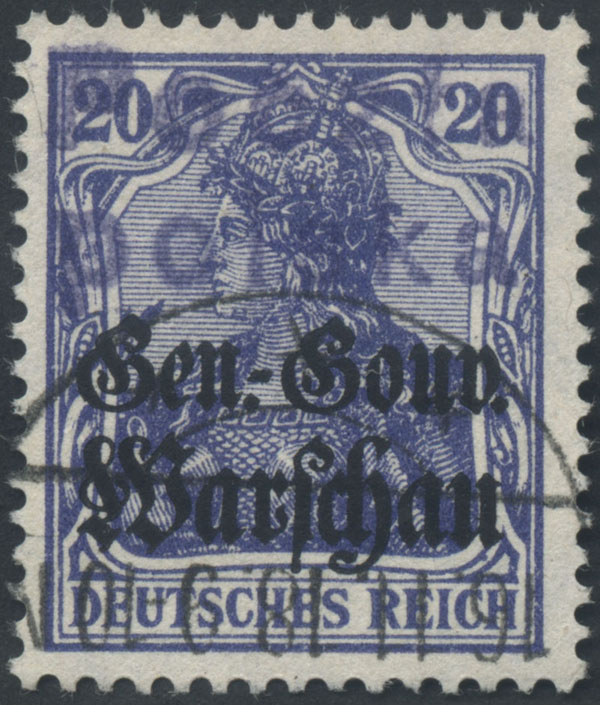 1918 Zduńska Wola - wydanie I, kasowany znaczek okupacji niemieckiej - "Gen.-Gouv. Warschau" za 40 f. z unikalnym nadrukiem lokalnym "POCZTA POLSKA / dwie beki" o wysokości 16 mm (Fi.4500.-), to jedno z najrzadszych wydań poczt lokalnych, gwarancja firmowa Gryżewski, Rachmanow, Bojanowicz, Jungjohann BPP. | Fi.8 |