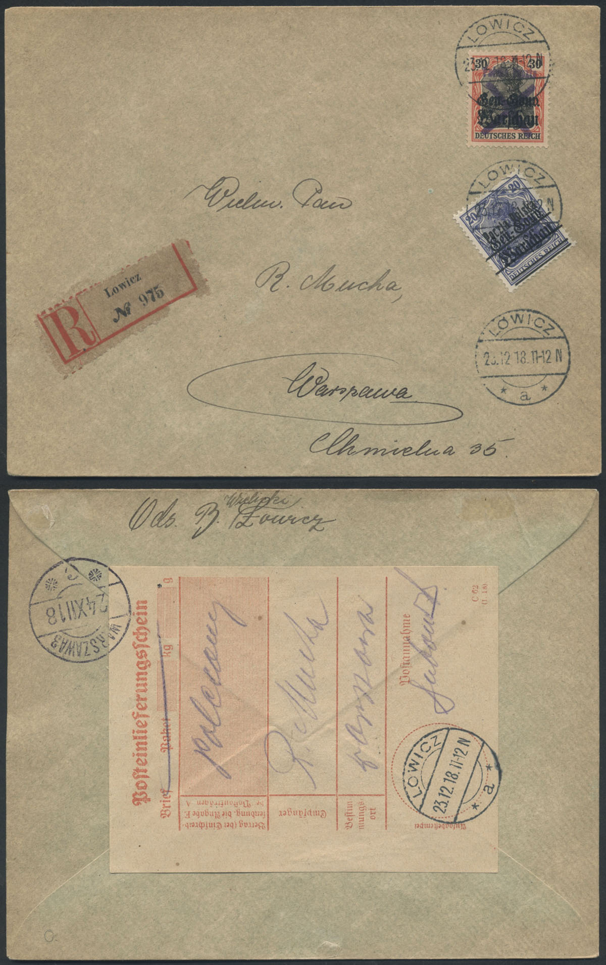 1918 Łowicz, list polecony z Łowicza nadany 23.12.18 do Warszawy, list opłacony znaczkami z nadrukiem lokalnym Łowicza, list prawidłowo opłacony, na odwrocie stempel odbiorczy i dowód nadania. | |
