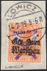 1918 Włocławek, wycinek z obiegowego listu opłaconego znaczkami dwóch wydań przedrukowych unieważnionych stemplem prowizorycznym Włocławka, gwarancja. | Fi.8, 19 |