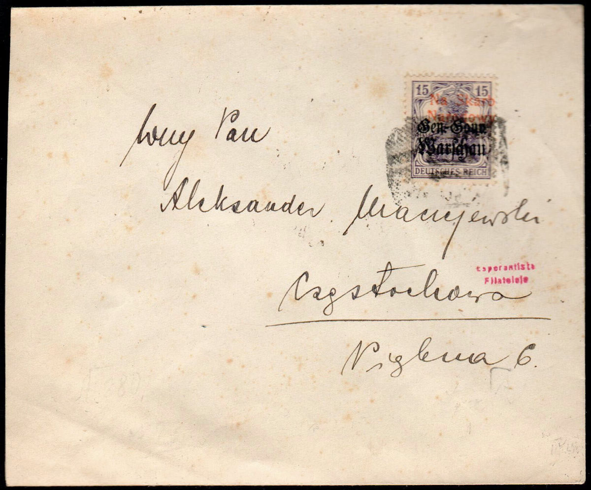1918 Włocławek, list z Włocławka do Częstochowy opłacony znaczkiem z nadrukiem lokalnym „Na Skarb Narodowy" w kolorze czerwonym skasowanym prowizorycznym stemplem Włocławka. | Fi.IIb |