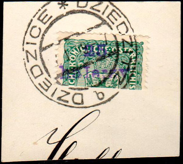 1919 Dziedzice, połówka znaczka z nadrukiem lokalnym na wycinku. | Fi.2 |