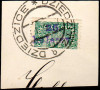 1918 Włocławek, wycinek z listu obiegowego opłaconego znaczkami z nadrukiem lokalnym Włocłwka unieważnione miejscowym stemplem prowizorycznym, fotoatest Šedivý. | Fi.5, 8 |