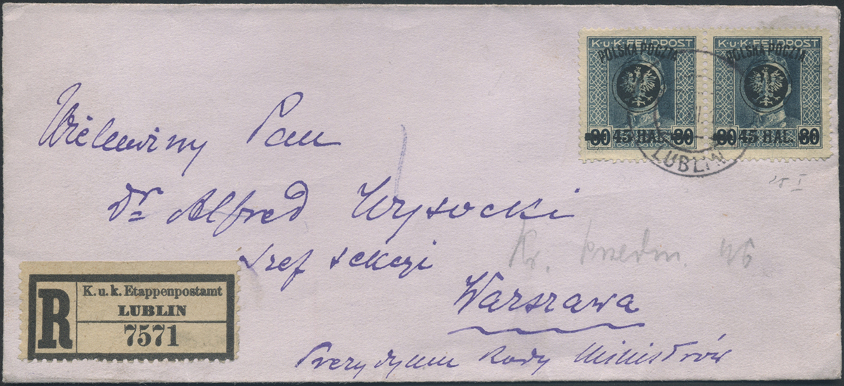 1918 drugie wydanie lubelskie, list polecony nadany 10.01.19 z Lublina do Warszawy, mieszana frankatura ze znaczkiem austriackiej poczty polowej dla Bośni i Herzegowiny, opłata zawyżona ze względu na brakujące niskie nominały, na odwrocie stempel odbiorczy, fotoatest Walocha. | Fi.25a Mi.25I |