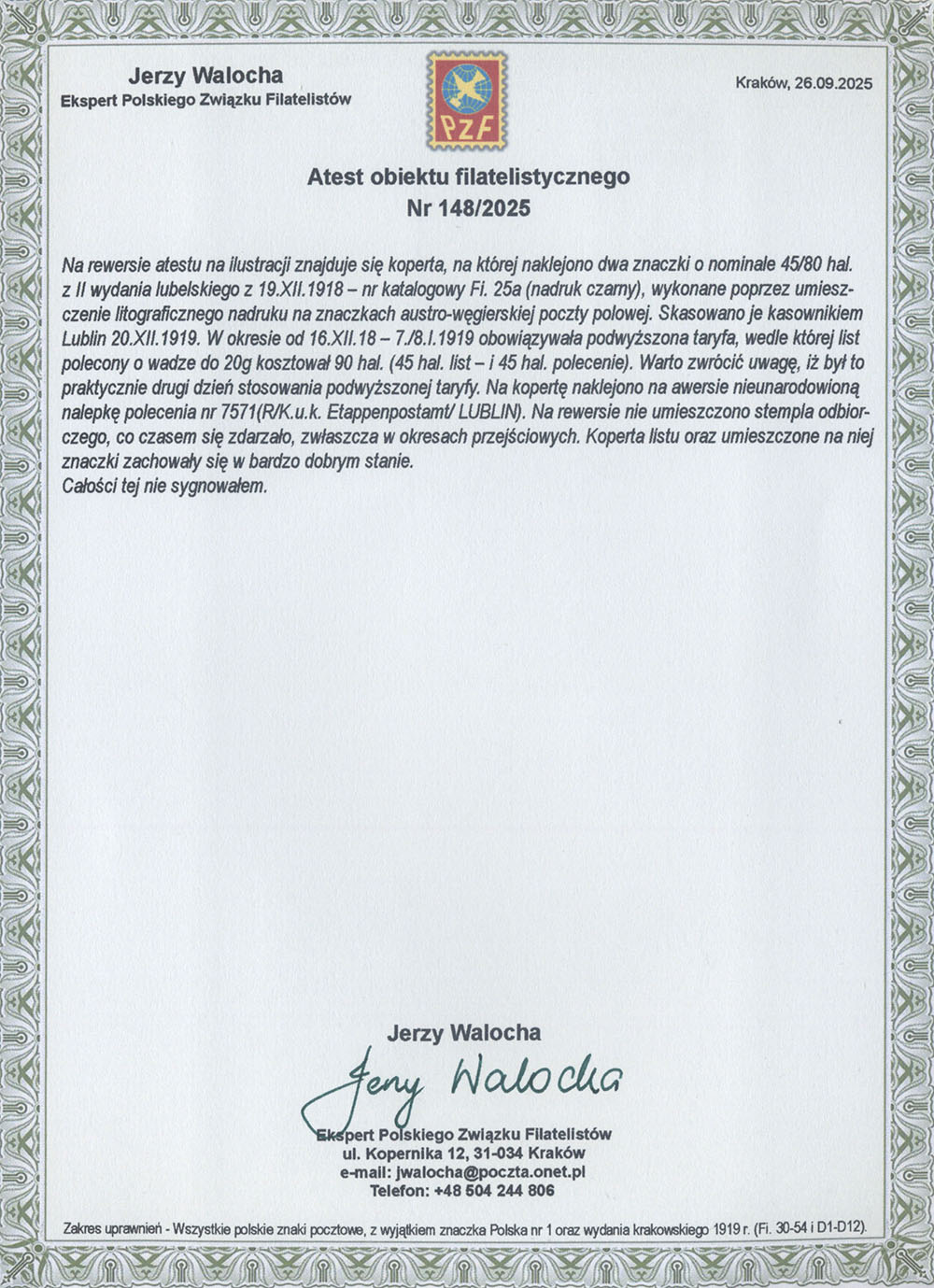 1918 drugie wydanie lubelskie, list polecony nadany 20.12.18 z Lublina do Warszawy, opłata według podwyższonej taryfy pocztowej w wysokości 90 halerzy, fotoatest Walocha. | Fi.25a Mi.25I |
