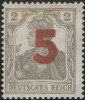 1919 wydanie poznańskie, znaczek za 5/2,5 fen. z przesuniętym w lewo delikatnym nadrukiem, na ząbku po prawej odbity koniec belki sąsiedniego znaczka, na odwrocie dobrze widoczny znak wodny, przedwojenna sygnatura, gwarancja Mikstein, gwarancja. | Fi.66 MK Mi.130 |
