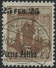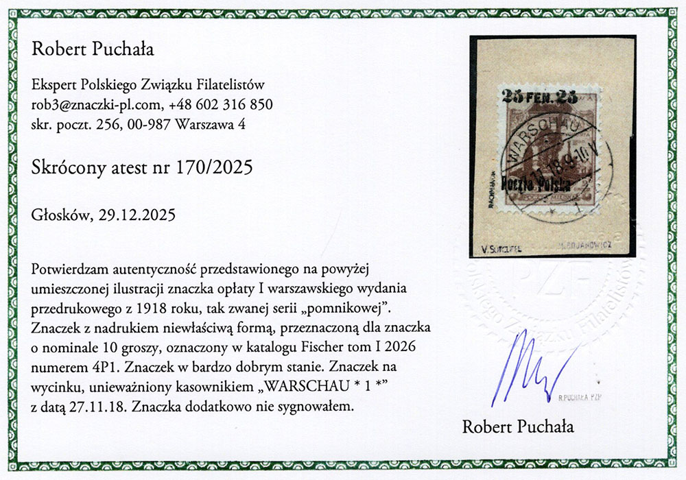 1918 seria pomnikowa, znaczek z nadrukiem niewłaściwą formą z nominałem 25 fen. przeznaczoną do nadruku na znaczkach poczty miejskiej za 10 gr., oznaczony w katalogu jako próba nadruku, fotoatest Puchała. | Fi.4P1 |
