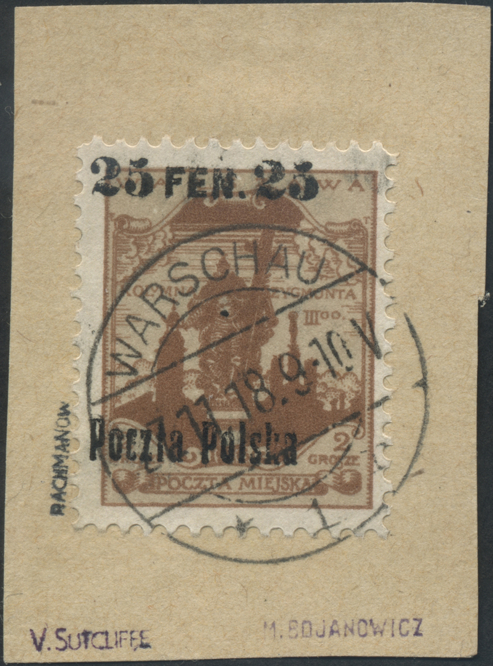 1918 seria pomnikowa, znaczek z nadrukiem niewłaściwą formą z nominałem 25 fen. przeznaczoną do nadruku na znaczkach poczty miejskiej za 10 gr., oznaczony w katalogu jako próba nadruku, gwarancja. | Fi.4P1 |