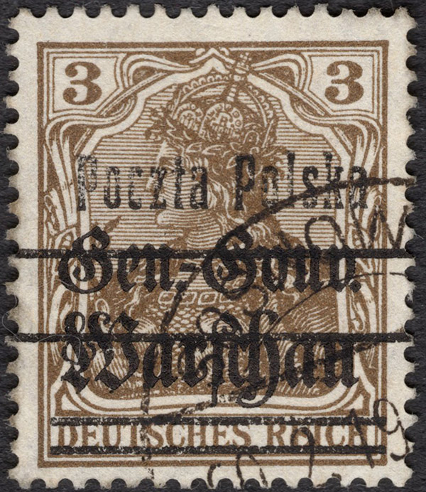 1918 wydanie PP/GGW, znaczek z nadrukiem GGW farbą anilinową, gwarancja i oznaczenie. | Fi.6d Mi.6 |
