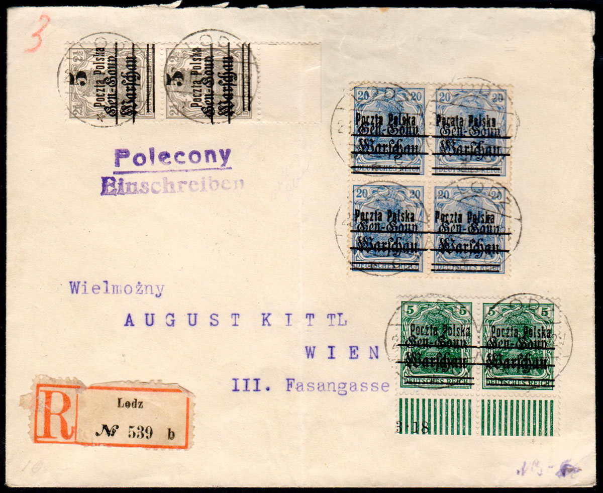 1918 wydanie PP/GGW, list polecony z Łodzi do Wiednia, znaczek za 20 fen. z błędem "Pocata", zawyżona opłata. | Fi.7I, 8I, 12cI |