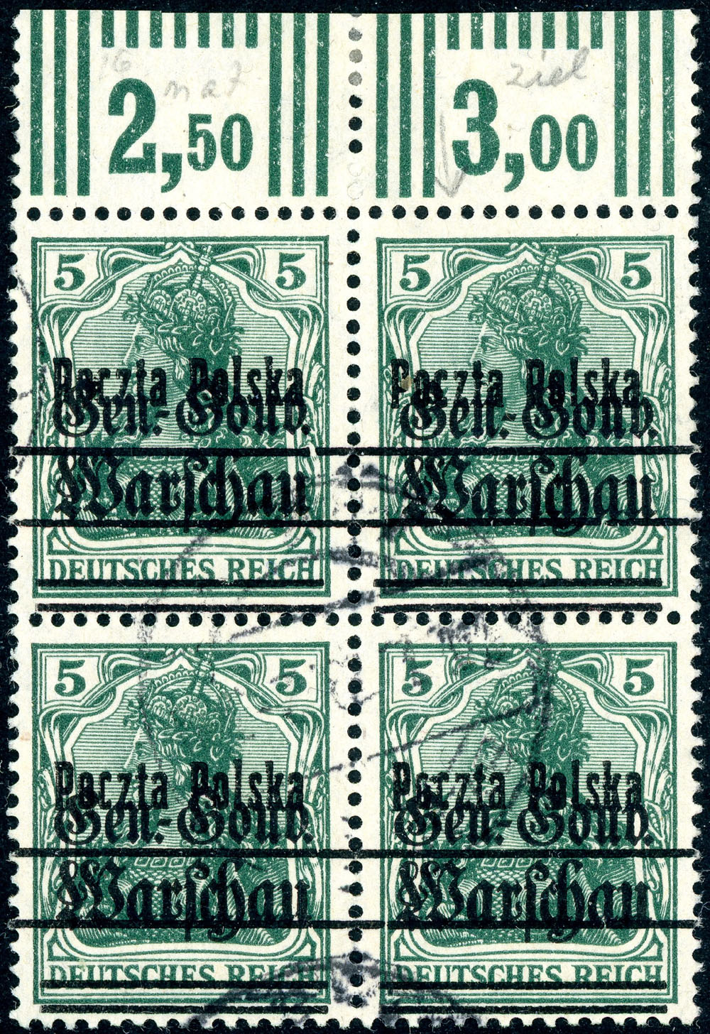 1918 wydanie PP/GGW, czworoblok z nadrukiem pierwszą formą z szczątkowym drukiem podwójnym. | Fi.7IMK Mi.7I |