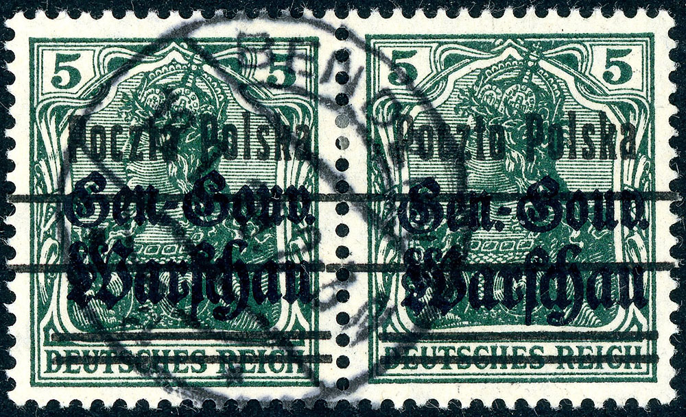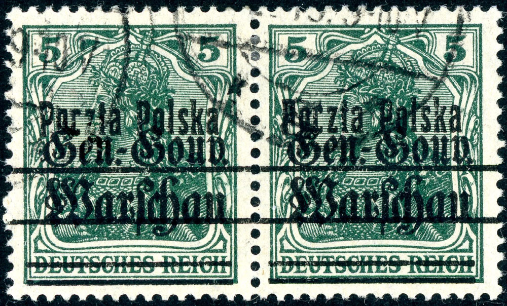 1918 wydanie PP/GGW, parka znaczków z nadrukiem GGW farba anilinową, lewy znaczek z usterką "cienkie c", prawy z błędem "rozsunięte Po i ols", gwarancja i oznaczenie Berbeka. | Fi.6dB9 Mi.6 |