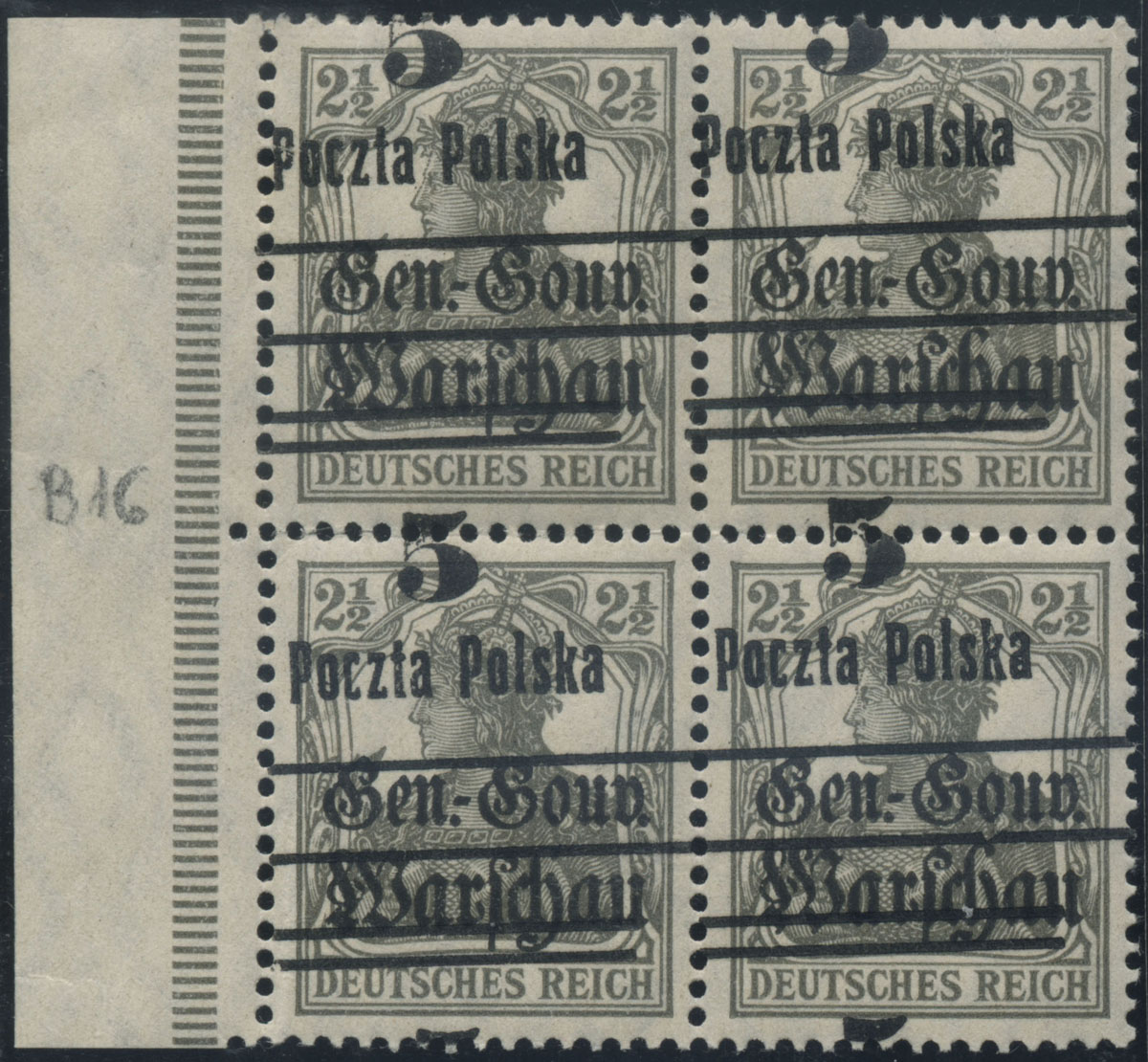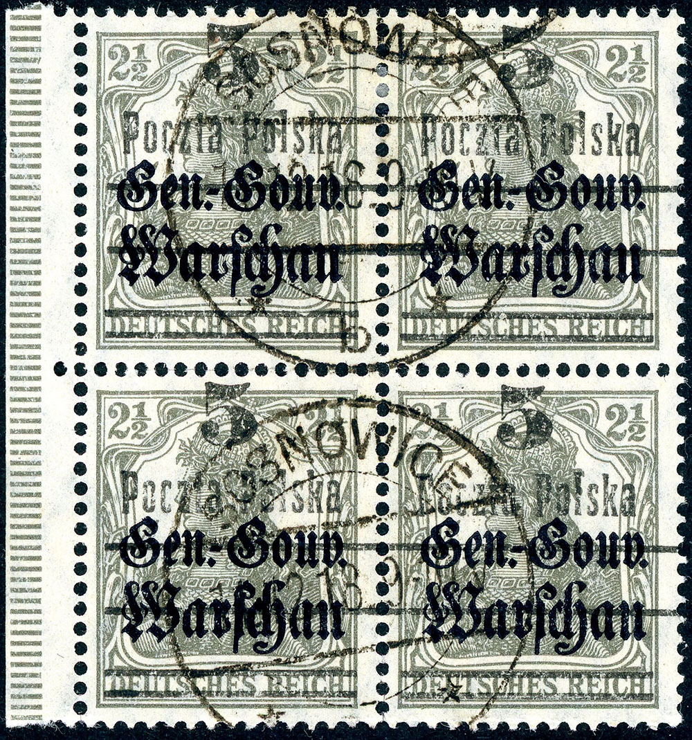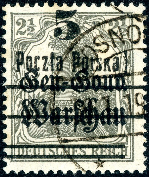 1918 wydanie PP/GGW, znaczek za 5/2,5 fen. z nadrukiem drugą formą, z rzadkim błędem nadruku GGW "kropka między n w Gen. i pierwszym a w Warschau", bez podlepki, ale z lekkim zmatowieniem na gumie, liczony jak podlepkowy, gwarancja. | Fi.8aII B Mi.14II |