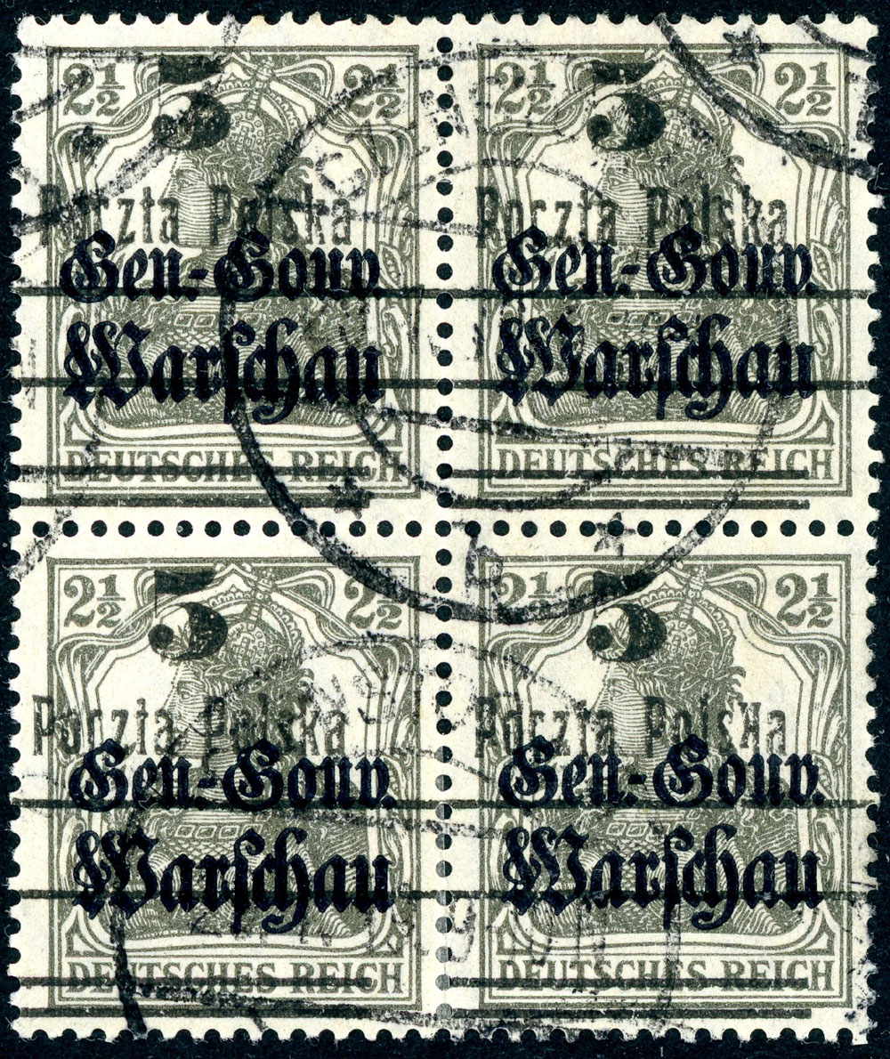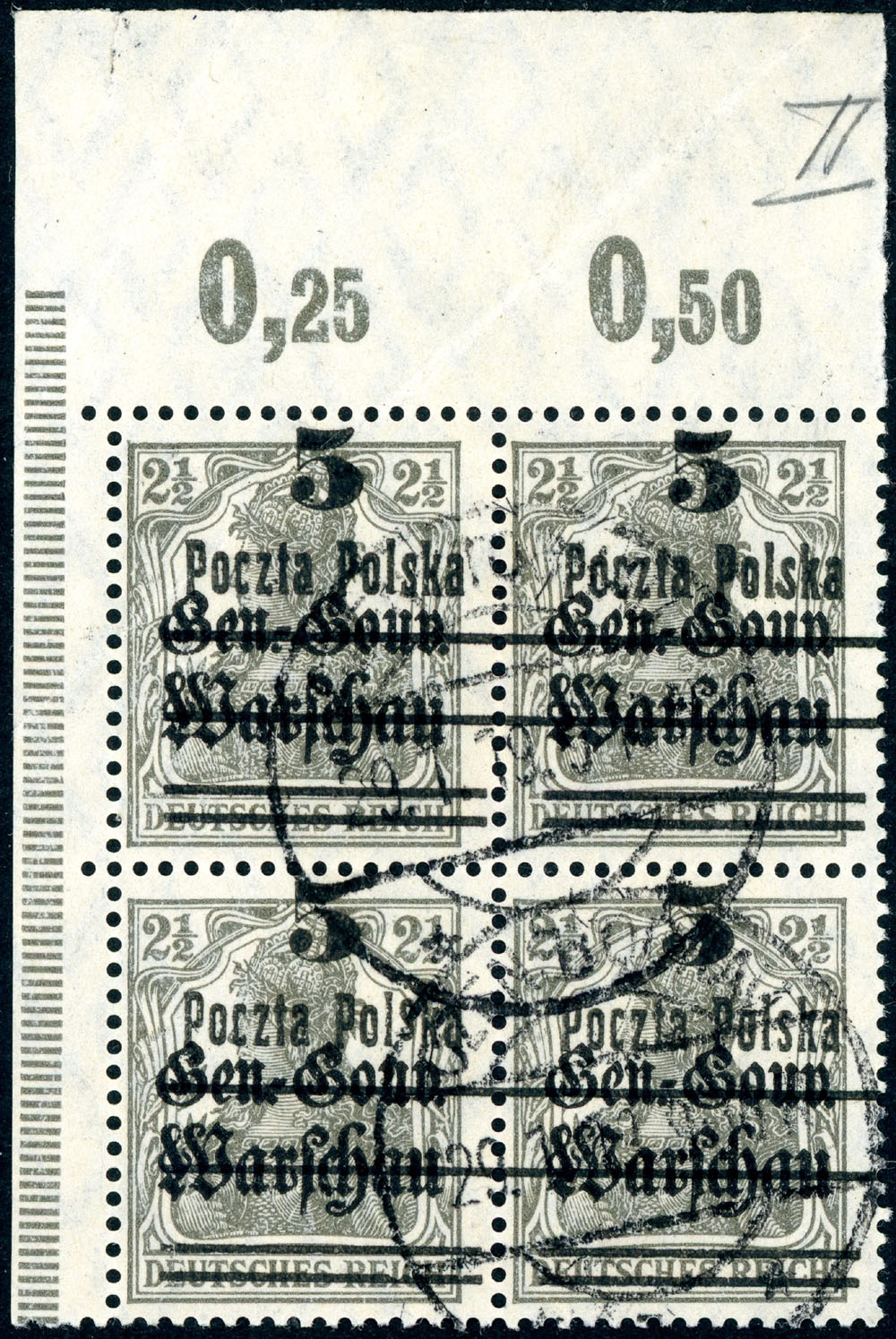 1918 wydanie PP/GGW, czworoblok z nadrukiem drugiej formy, lewy dolny znaczek z błędem "odwrócone k", prawy dolny z usterką "uszkodzona litera a w Polska, gwarancja i oznaczenie Wiatrowski. | Fi.8aIIB7 Mi.14II |