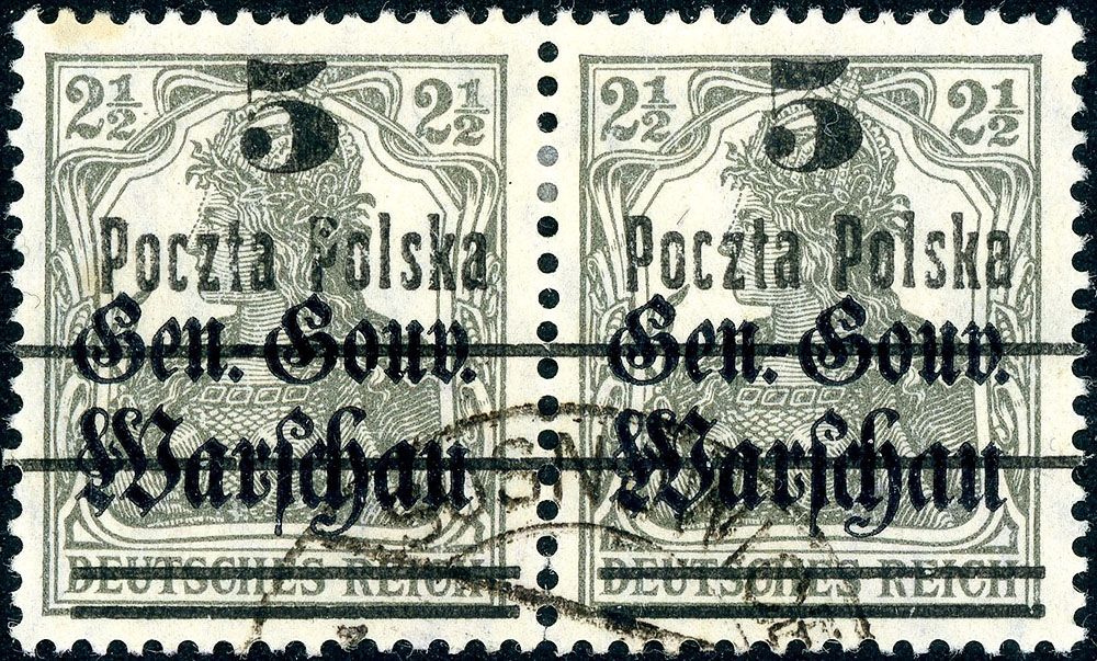 1918 wydanie PP/GGW, parka znaczków z przesuniętym nadrukiem pierwszej formy, gwarancja i oznaczenie. | Fi.8aI MK Mi.14I |