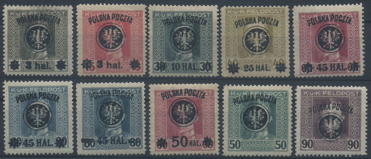 1918 drugie wydanie lubelskie, podstawowa seria plus znaczek za 10 hal. z nadrukiem w barwie fioletowobrązowej, wszystkie znaczki gwarancja. | Fi.20-29, 22b Mi.20-8, 22b |