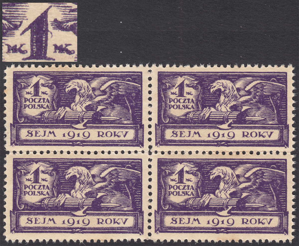 1919 Sejm Ustawodawczy - Orzeł, czworoblok znaczków za 1 mk., lewy górny z ciekawym błędem na poz.45 - niekatalogowanym, ale opisanym w PZP pod numerem 19, "ogonek na prawej krawędzi cyfry 1", gwarancja i opis Walocha. | Fi.113 B Mi.129 |