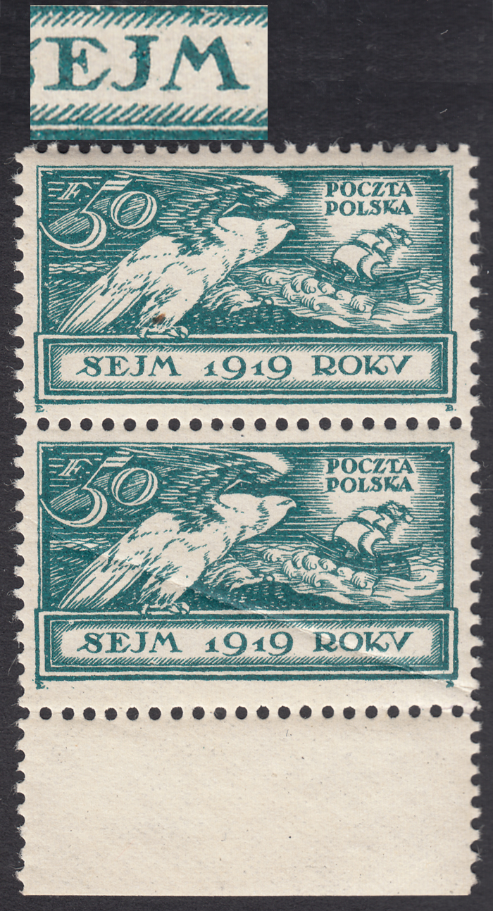 1919 Sejm Ustawodawczy - Orzeł i Okręt, marginesowa parka znaczków za 50 fen., górny z błędem na poz.82 - niekatalogowanym, ale opisanym w PZP pod numerem 13, "plamka przed literą J w SEJM", znaczek z błędem w bardzo ładnym stanie, dolny co widać na skanie złamany, ale pomaga ustalić pozycję błędu, gwarancja i opis Walocha. | Fi.112 B Mi.128 |