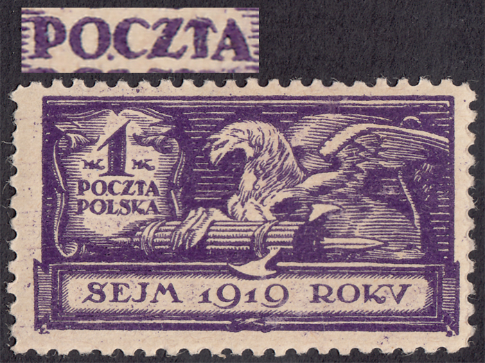 1919 Sejm Ustawodawczy - Orzeł, znaczek za 1 mk., lewy górny z błędem na poz.81 - niekatalogowanym, ale opisanym w PZP pod numerem 26, "kropka pod literami OC w POCZTA", gwarancja i opis Walocha. | Fi.113 B Mi.129 |