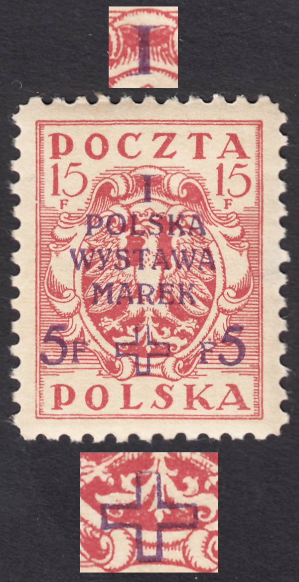 1919 I Polska Wystawa Marek, znaczek za 15+5 f. z błędem na poz.58 "brak dolnego prawego szeryfa w I" oraz "krzyż otwarty od góry", gwarancja Walocha. | Fi.104B B Mi.102A |