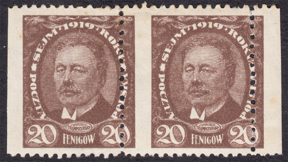 1919 Sejm Ustawodawczy - Marszałek Sejmu W.Trąpczyński - duży format, parka makulatury znaczków za 20 fen. z tak znacznie przesuniętym w poziomie rysunkiem znaczka (ząbkowaniem pionowym), że aby zachowac cały rysunek trzeba je wycinać z arkusza - niekatalogowane, jeden znaczek bez, drugi z lekkim śladem podlepki, gwarancja i oznaczenie Walocha. | Fi.109 MK Mi.125 |