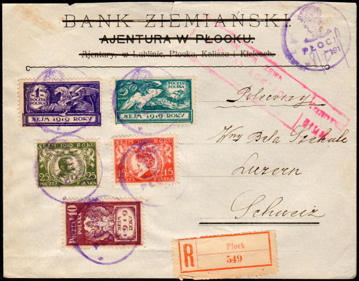 1919 Płock, list polecony wysłany 8.07.19 z Płocka do Szwajcarii, znaczki unieważnione prowizorycznym stemplem Płocka, czerwona nalepka polecenia z Płocka, warszawski stempel cenzury, na odwrocie stempel odbiorczy. | Fi.107-8, 111-3 |