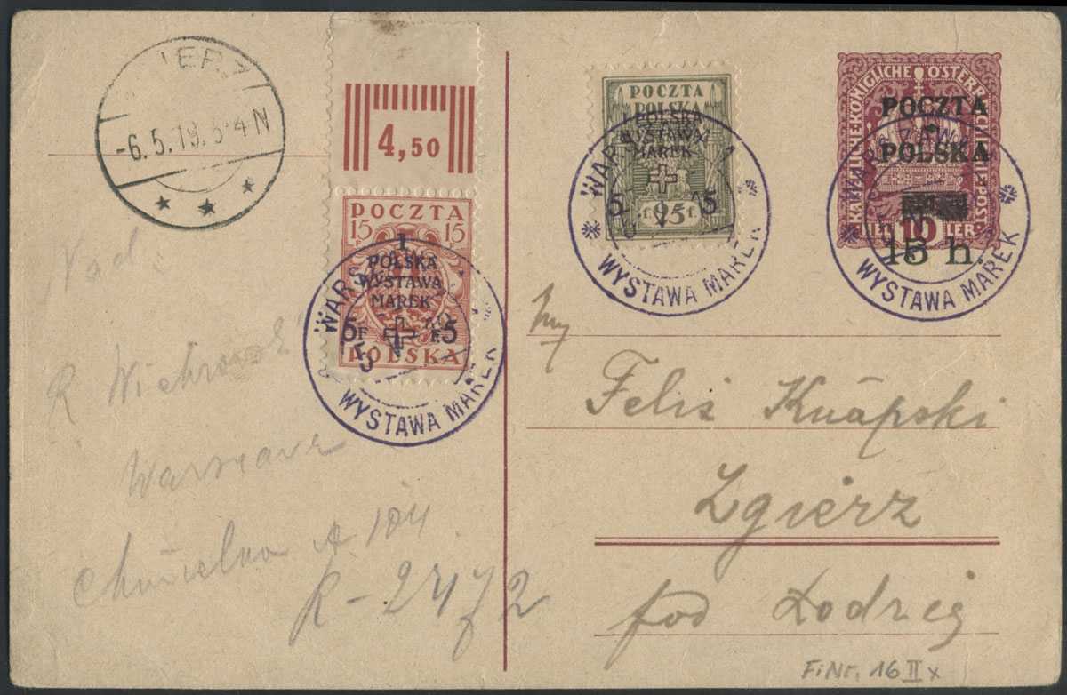 1919 I Polska Wystawa Marek, znaczki ząbkowane na miejscowej karcie poleconej przesłanej 3 V w Warszawie, usterki nadruku na znaczku za 50 fen "prawa 5 nominału uszkodzona u dołu" i kilka uszkodzeń liter nadruku (najbardziej widoczne zaznaczono strzałkami); znaczki skasowane PIERWSZYM POLSKIM STEMPLEM OKOLICZNOŚCIOWYM - WYSTAWA MAREK, jako stempelka polecenia użyto numeratora; dobry stan zachowania (Myślicki 19 001). | Fi.104-06B Mi.120-22A |