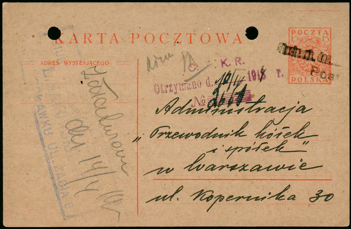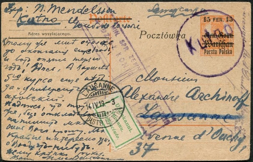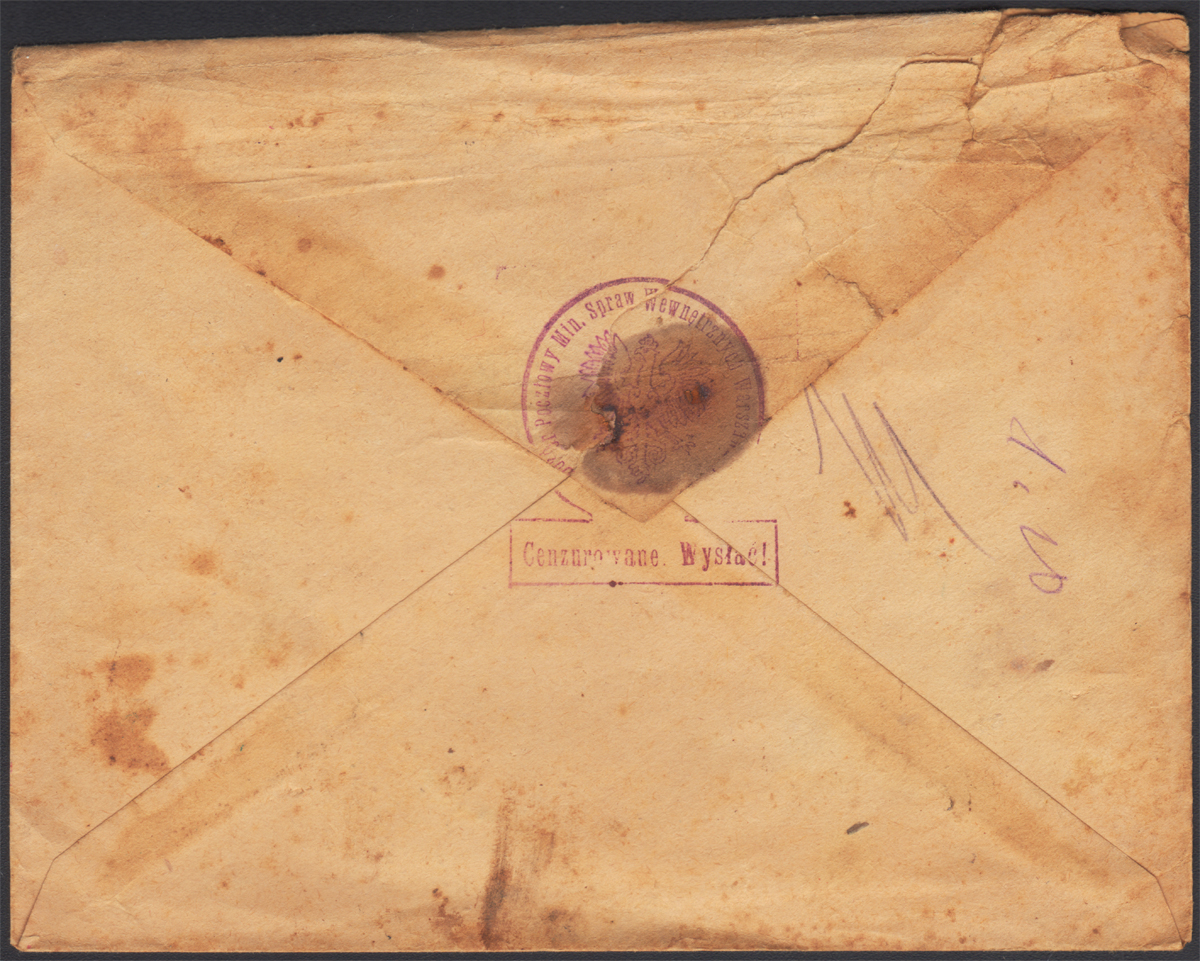 1919 "Kancelarja Dep. II M.S.Z. Kontrola listów prywatnych", list na koszt odbiorcy z Ministerstwa Spraw Zagranicznych przesłany miejscowo w Warszawie, okrągły stempel "MINISTERSTWO SPRAW ZAGRANICZNYCH Pieczęć do listów", bardzo rzadki stempelek cenzury "Kancelarja Dep. II M.S.Z. Kontrola listów prywatnych" z datą "15.KWC.1919" dostawioną osobnym stempelkiem, datownik urzędu nadawczego WARSZAWA 1 z 16-4, na odwrocie stempelek cenzury "Dozór Pocztowy Min. Spraw Wewnętrznych Warszawa 1 Cenzurowane Wysłać!", dwa różne owalne stempelki dopłaty "POBRAĆ ...m...f VII WARSZAWA I" i "Pobrać" z dopisaną wartością "50 f"; bardzo rzadki walor w słabym stanie zachowania. | |