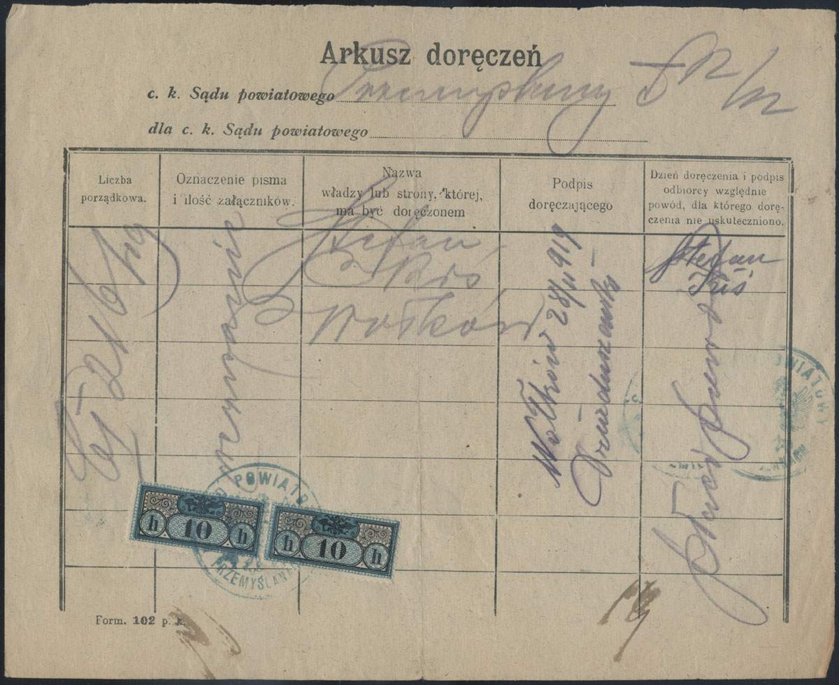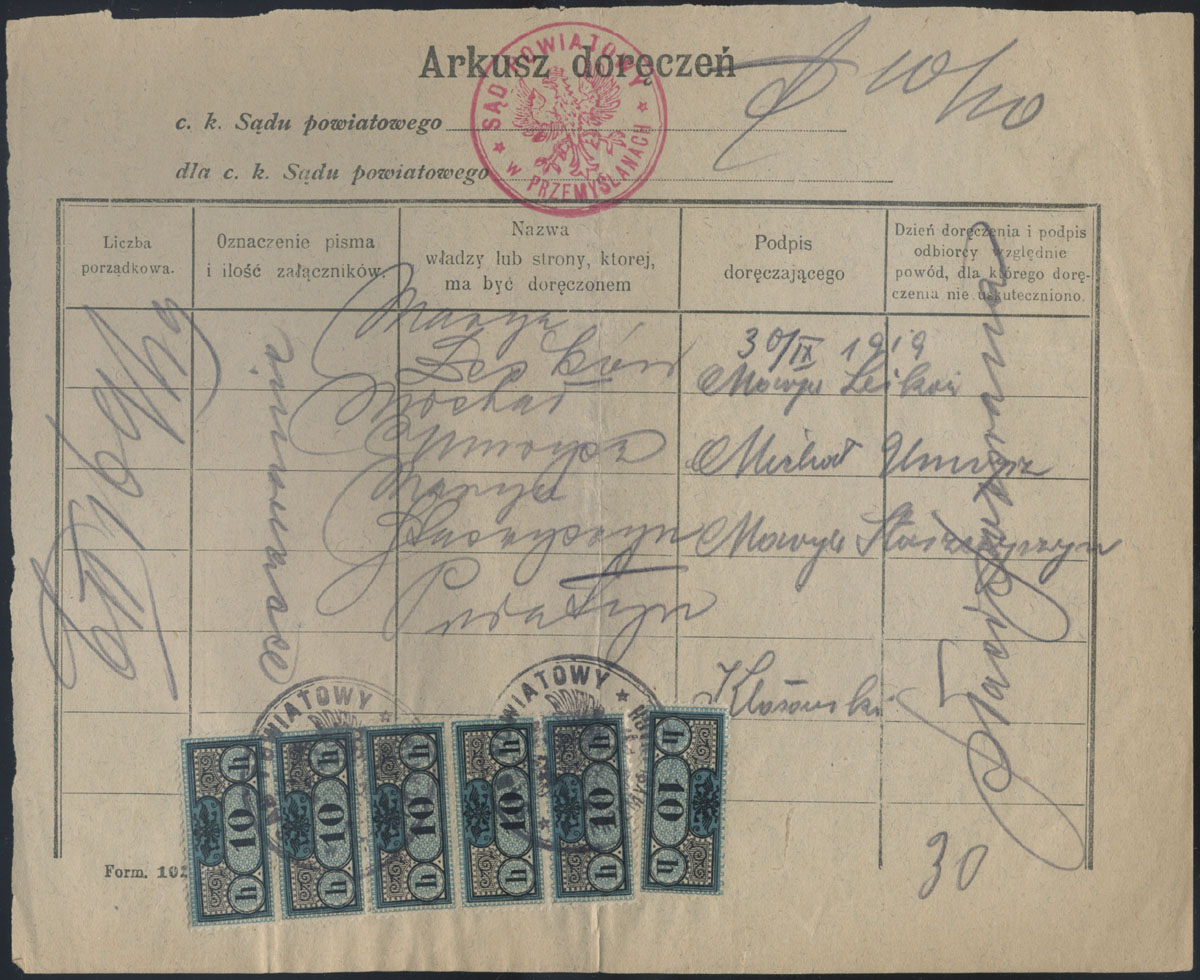 1919 znaczki sądowe na arkuszu doręczeń sądu w Przemyślanach. | Fi.III |
