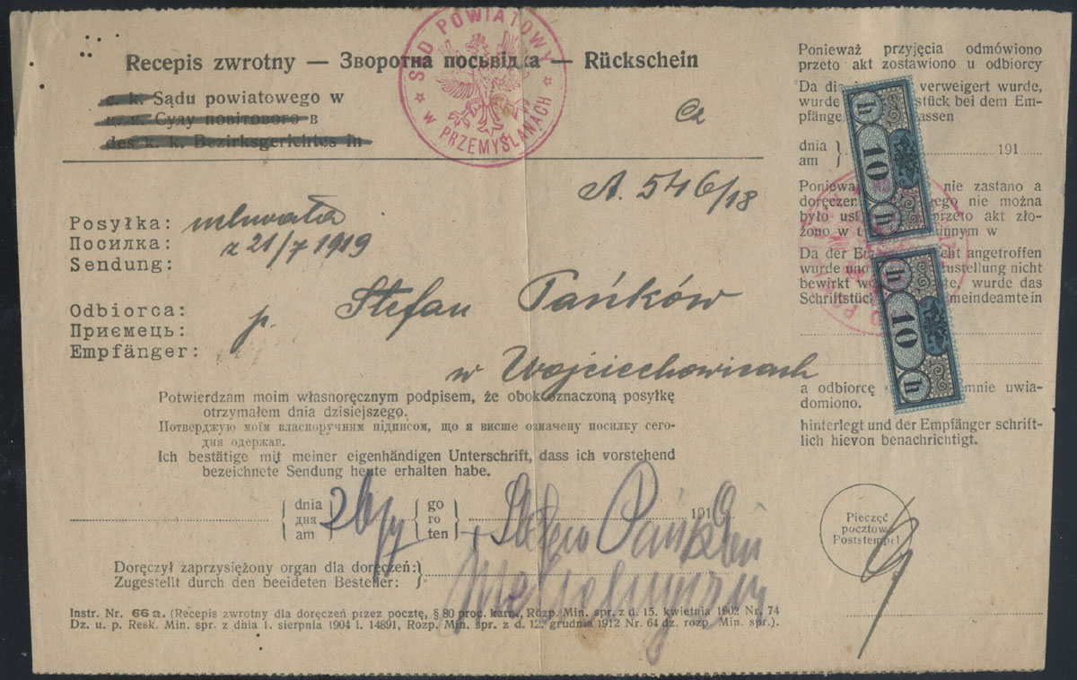 1919 znaczki sądowe na recypisie zwrotnym sądu w Przemyślanach. | Fi.III |