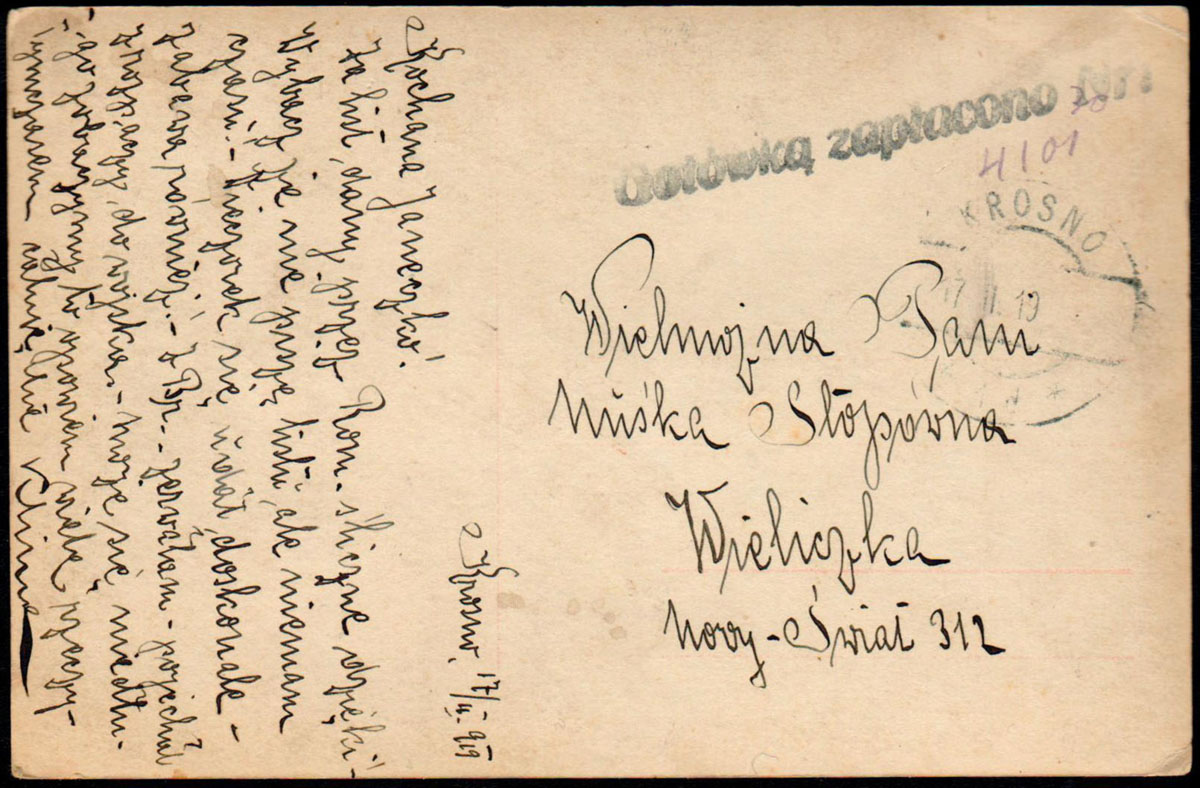 1919 kartka z Krosna do Wieliczki, opłatę pobrano w gotówce co potwierdza stempel „Gotówką zapłacono nr.". | |
