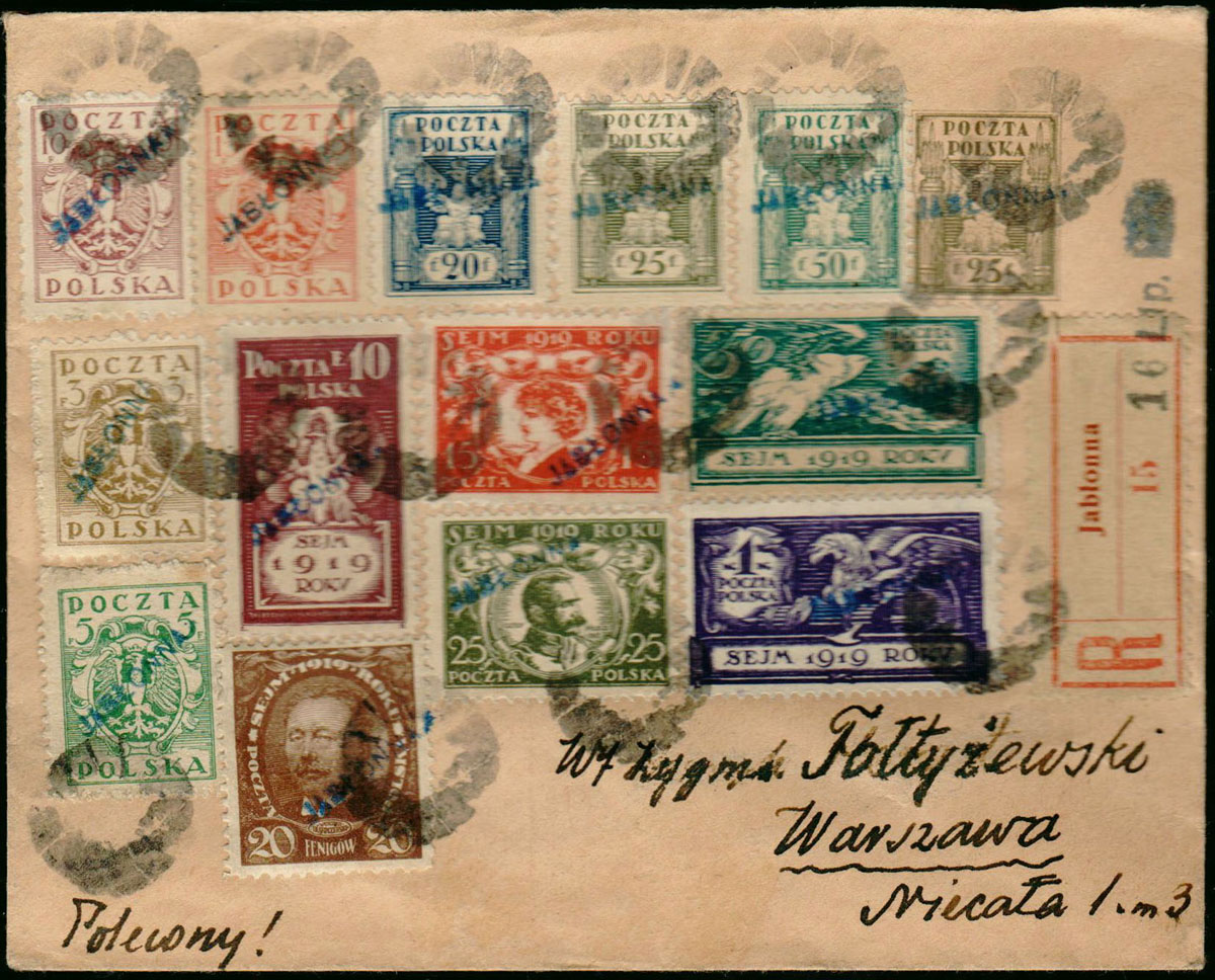 1919 Jabłonna, filatelistyczny list polecony z Jabłonnej do Warszawy, znaczki unieważnione dwoma stemplami prowizorycznymi Jabłonnej, rzadka czerwona erka Jabłonnej, na odwrocie stempel odbiorczy. | |