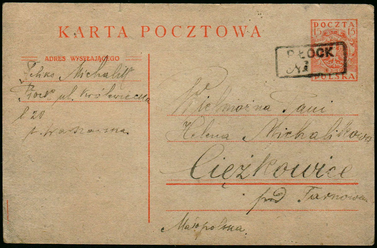 1919 Płock, kartka z Płocka do Ciężkowic, prowizoryczny stempel „PŁOCK / Nr". | Fi.Cp24 |
